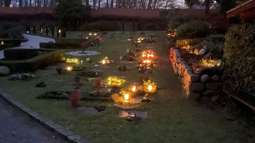 Vi tænder mange lys ved gudstjenesten, og når gudstjenesten er slut, er alle velkomne til at bære lys ud på kirkegården og sætte dem på gravene. Vi serverer en kop varm suppe.