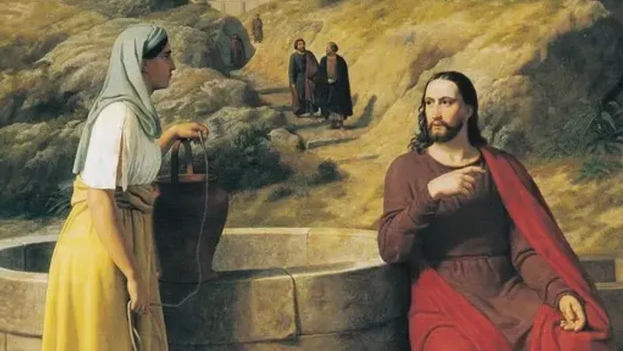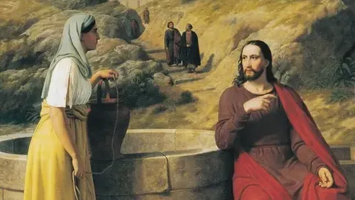 En helt almindelig hverdags begivenhed, hvor vejfarende stopper ved brønden og får et hvil og en tår vand. Men inden længe bliver den samaritanske kvinde revet ind i den mest uforudsigelige samtale, hun nogen sinde har været ude for. Det begynder med vand men hun skal få større ting at se, og vi må gå ud fra at hun går fra brønden den dag som en anden end da hun kom.